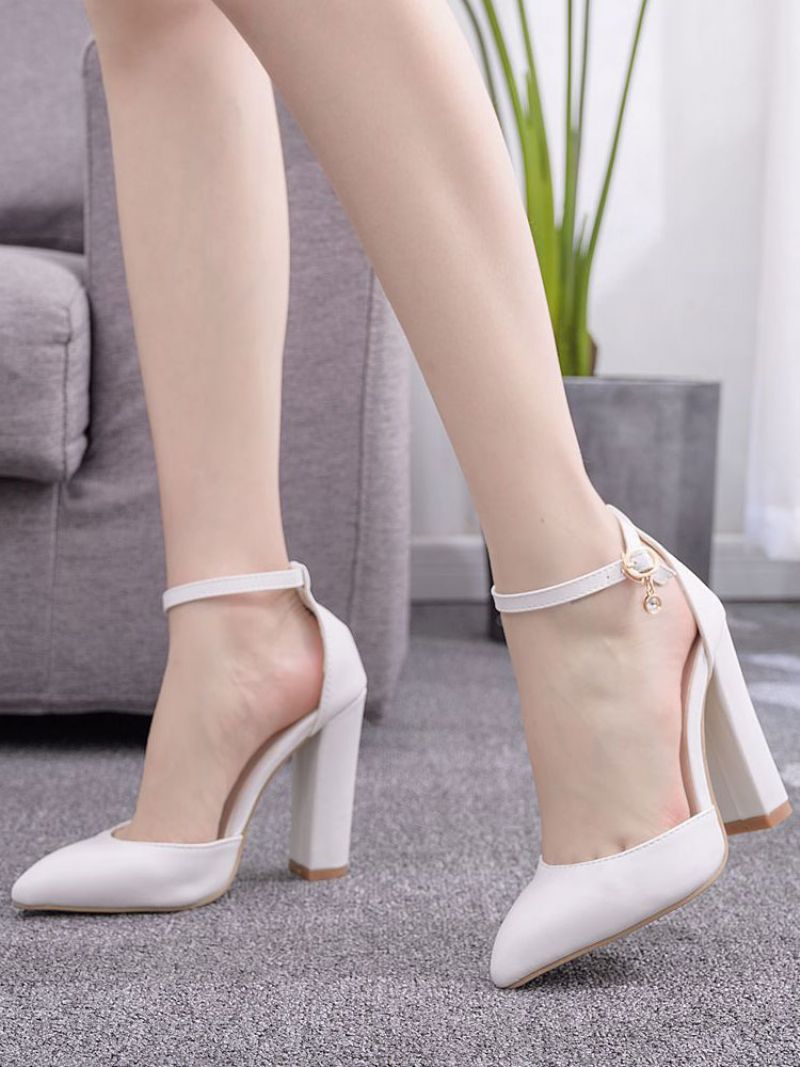 Białe Sandały Na Obcasie Dla Kobiet Gruby Obcas Szpiczasty Nosek Pu Skórzane Seksowne Szpilki Z Paskiem Kostkę