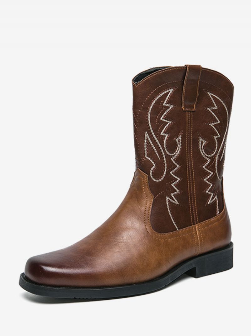 Buty Męskie Kowbojskie Kawowo-brązowe Pu Skóra Okrągłe Noski Haftowane