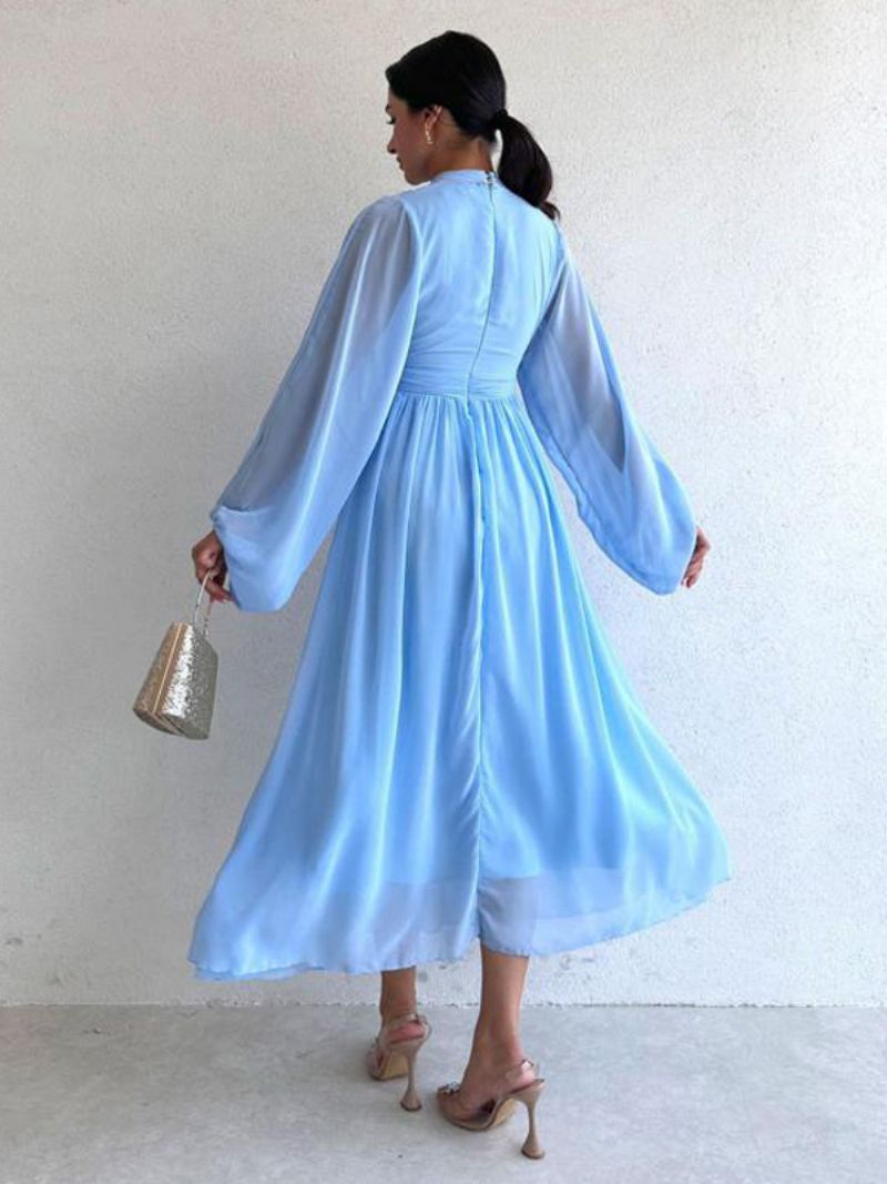 Ciemnogranatowa Sukienka Damska Plisowana Z Długimi Rękawami Tiulowa Podwyższona Talia
