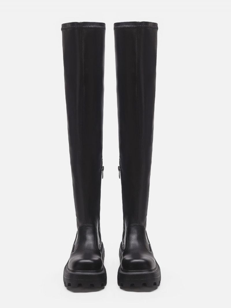 CZarne Buty Do Kolan Damskie Na Płaskim Obcasie Z Okrągłym CZubkiem