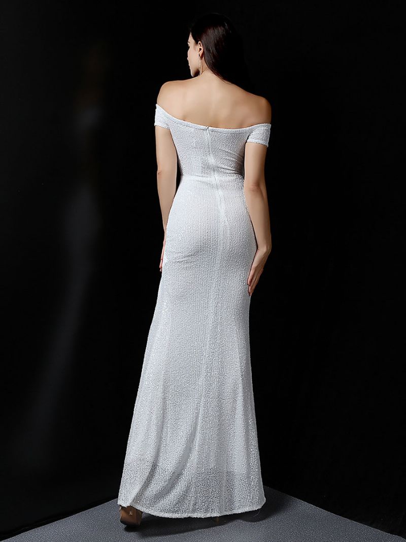 Damska Cekinowa Sukienka Na Imprezę Z Odkrytymi Ramionami Wysokim Rozcięciem Długa Studniówkę