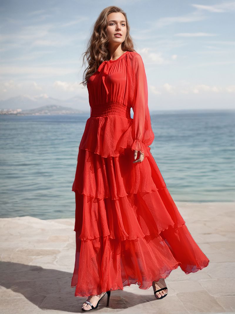 Damska CZerwona Wielowarstwowa Sukienka Z Kokardką Plisowana Okrągłym Dekoltem Boho Swobodne Sukienki Maxi