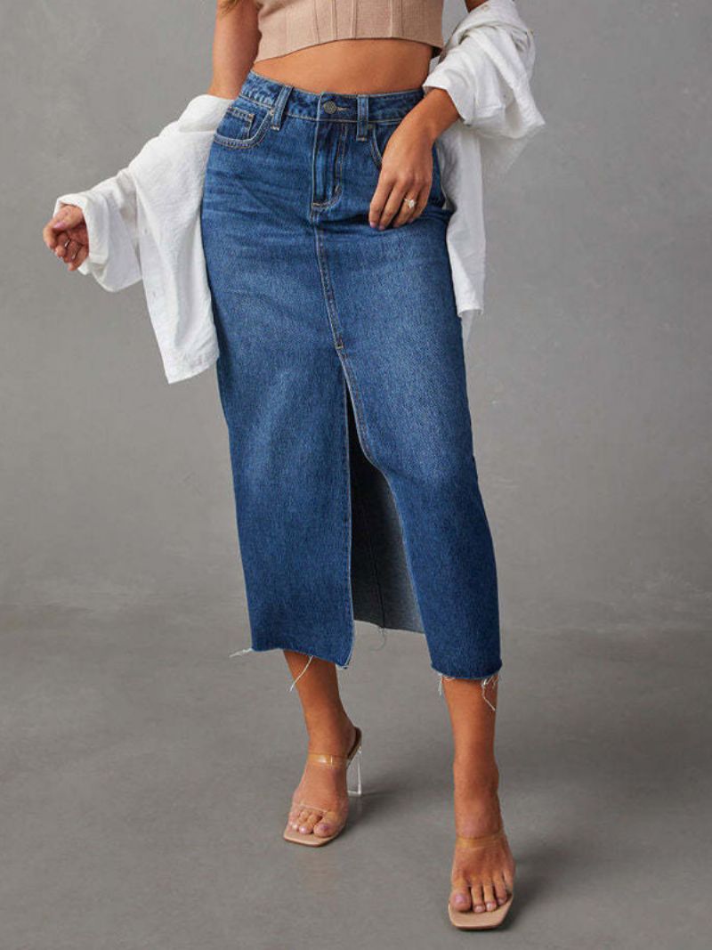 Damska Jeansowa Spódnica Z Pełną Spódnicą Podwyższonym Stanem Wysokim Rozcięciem Zamkiem Błyskawicznym I Spódnicami Frędzlami