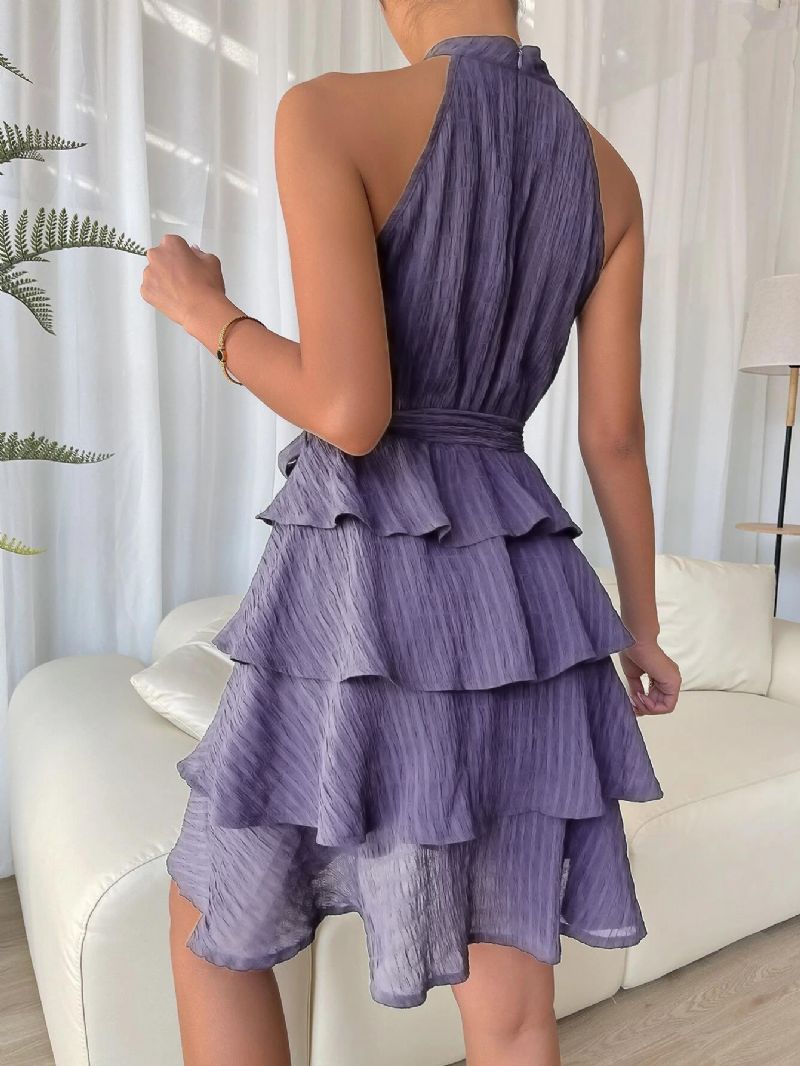 Damska Krótka Sukienka Wiązana Na Szyi Bez Rękawów Plisowana Z Paskiem Tiulowa Warstwowa Przyjęcie Sukienki Koktajlowe