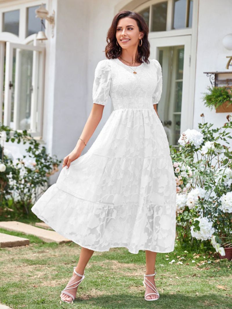 Damska Letnia Sukienka Midi W Kolorze Ecru Biała Koronkowa Plażowa Z Dekoltem Kształcie Klejnotu
