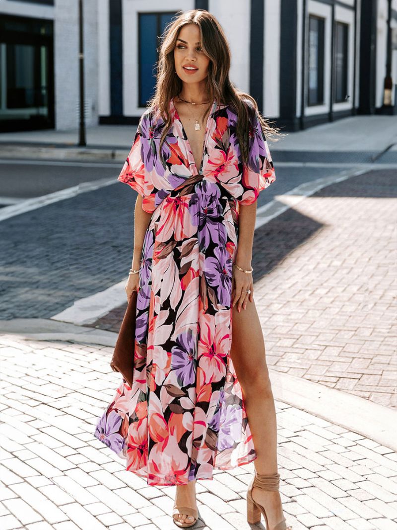 Damska Letnia Sukienka Z Dekoltem W Kształcie Litery V Kwiatowym Nadrukiem Niebieska Długa Plażowa