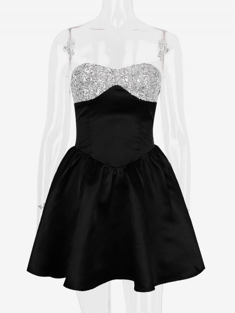 Damska Mała CZarna Sukienka Bez Ramiączek Cekinów Rękawów Z Falbanami Krótkie Sukienki Imprezowe