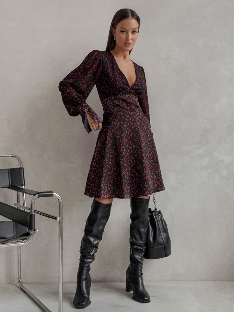 Damska Mini Sukienka W Kwiaty Długie Rękawy Dekolt Kształcie Litery V Plisowana Szykowna Krótka