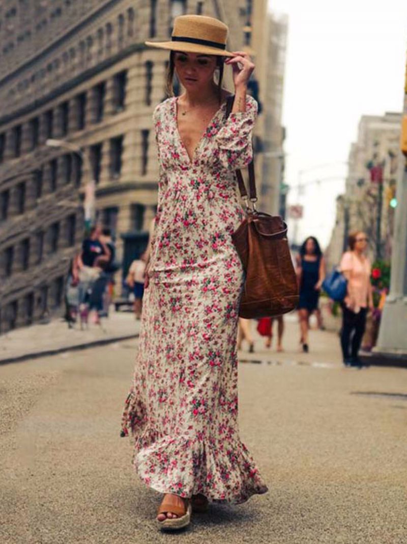 Damska Różowa Sukienka Maxi Z Dekoltem W Kształcie Litery V Długim Rękawem Falbaną Kwiatowym Nadrukiem Dopasowana Długa