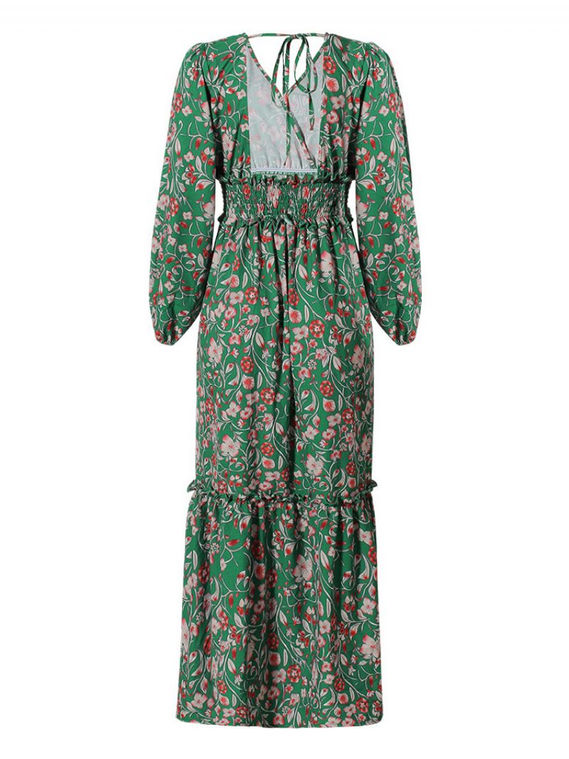 Damska Sukienka Maxi Dekolt W Szpic Długie Rękawy Swobodny Kwiatowy Nadruk Do Podłogi
