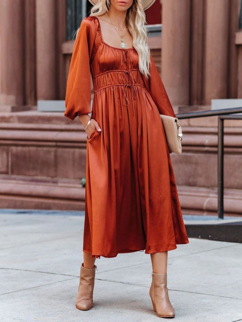 Damska Sukienka Maxi Kwadratowy Dekolt Długie Rękawy Pomarańczowo-czerwona Do Podłogi