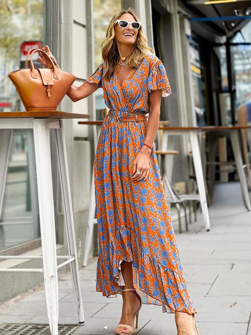 Damska Sukienka Maxi Z Dekoltem W Kształcie Litery V Krótkimi Rękawami I Drukowaną Szarfą Długa