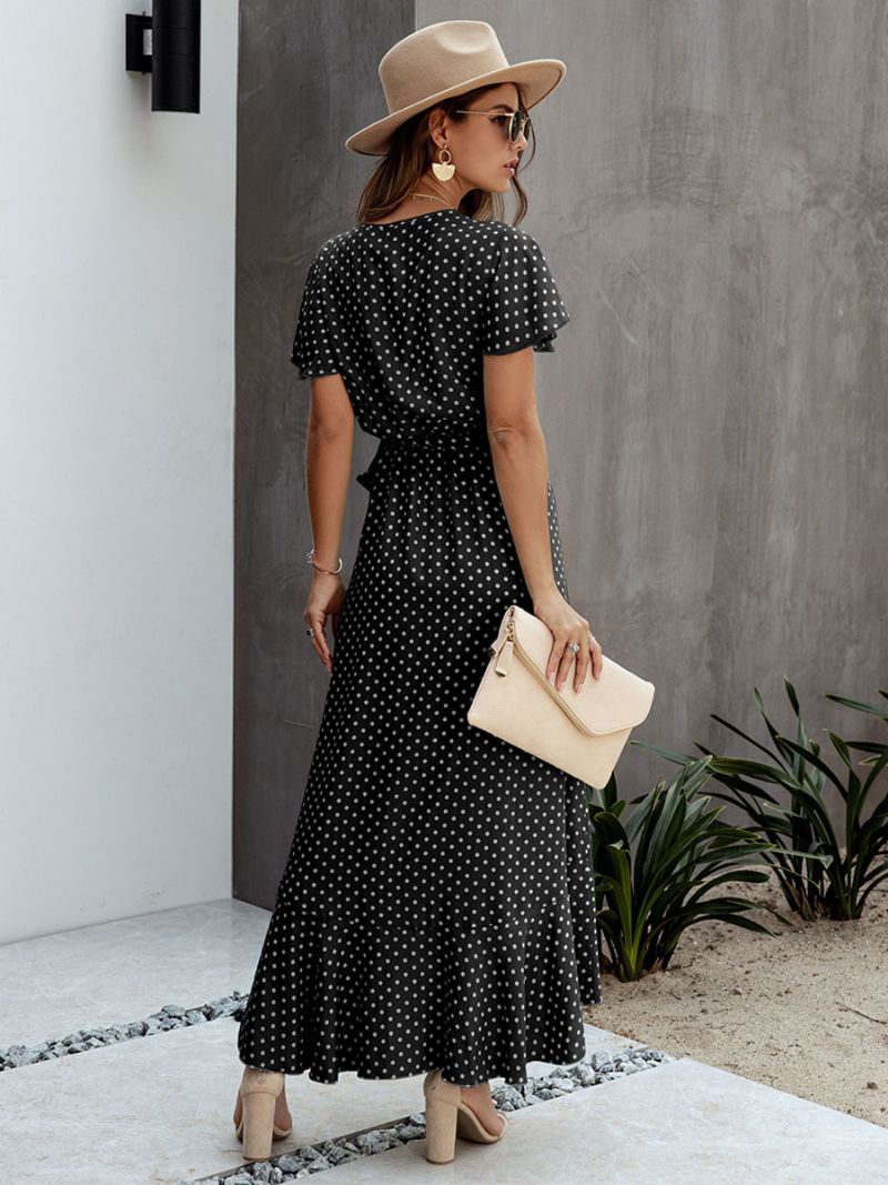 Damska Sukienka Maxi Z Dekoltem W Szpic I Krótkimi Rękawami Nadrukiem Długa
