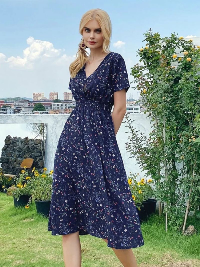 Damska Sukienka Midi Z Dekoltem W Kształcie Litery V Krótkimi Rękawami I Kwiatowym Nadrukiem Szykowna Letnia