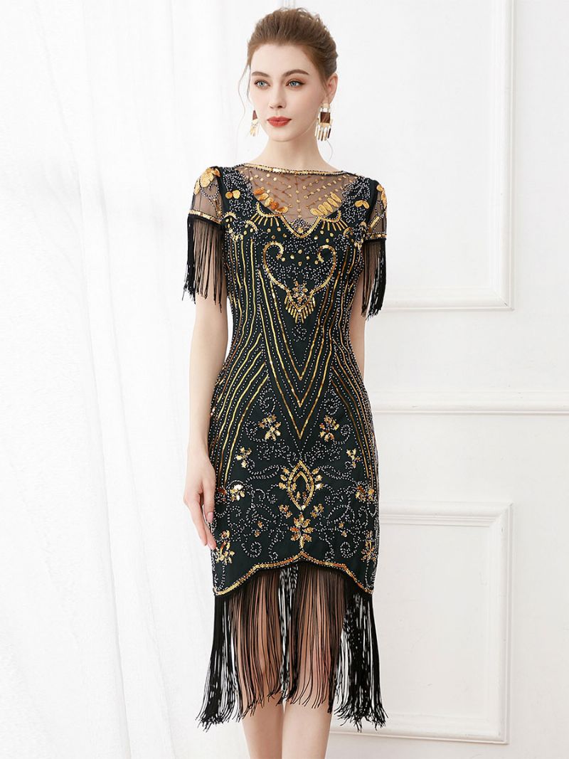 Damska Sukienka Retro Z Frędzlami Wycięciem Pod Szyją Cekinami Przezroczystymi Sukienkami Midi Na Przyjęcie Urodzinowe