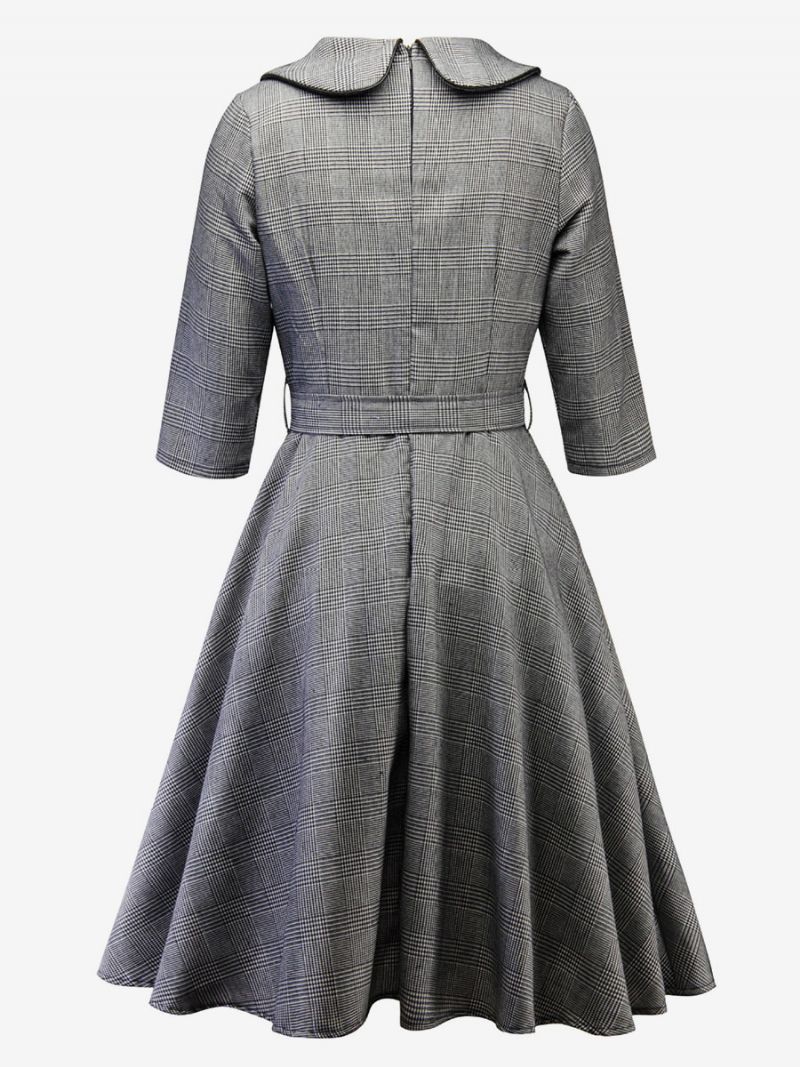 Damska Sukienka W Kratę Stylu Retro Z Nieregularnym Dekoltem Zapinana Na Guziki Sukienki Dzienne