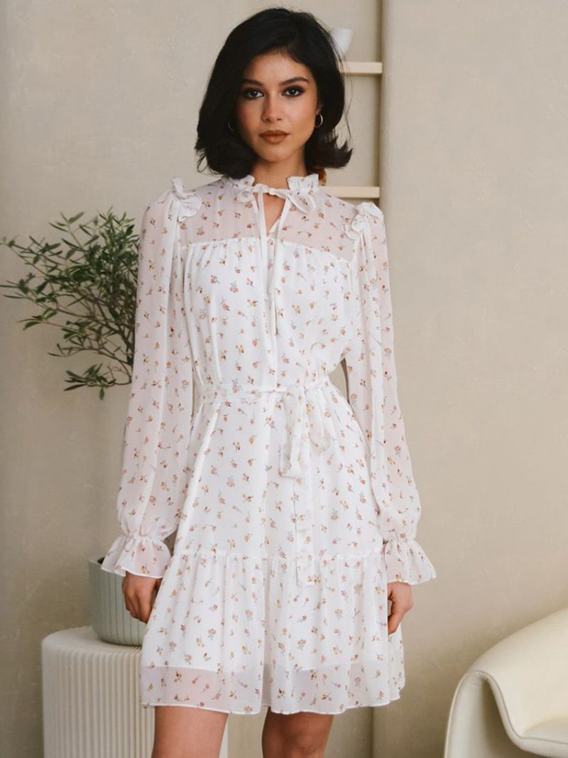 Damska Sukienka W Kwiaty Midi Kwiatowy Nadruk Długie Rękawy Ozdobny Kołnierzyk Szykowna Ponadgabarytowa Sznurowana Bez Otwartych Szwów Długi Jesienny