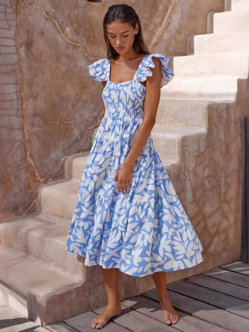 Damska Sukienka W Kwiaty Sukienki Maxi Kwiatowy Nadruk Bez Rękawów Kwadratowy Dekolt Eleganckie Falbany Otwartych Szwów Długie Lato