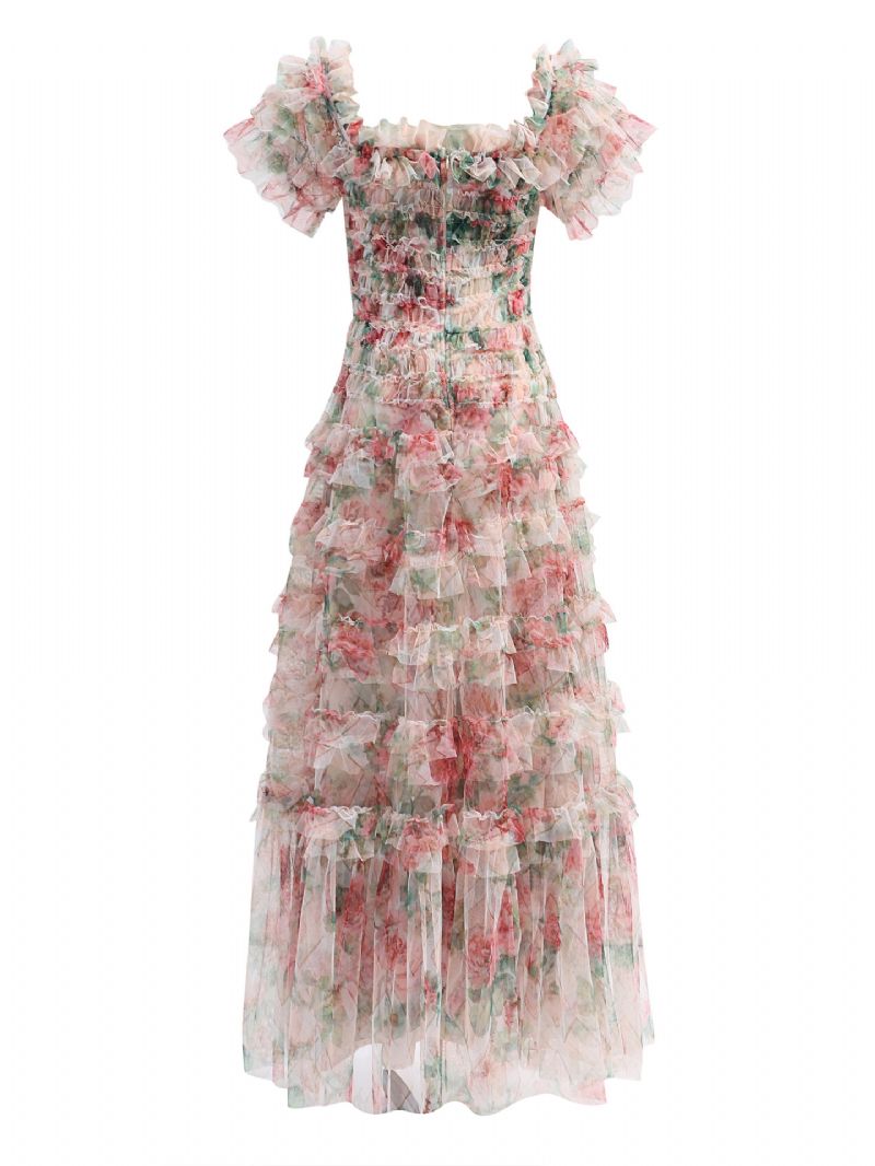 Damska Sukienka Z Falbaną Kwiatowy Tiulowy Nadrukiem Codzienna Letnia