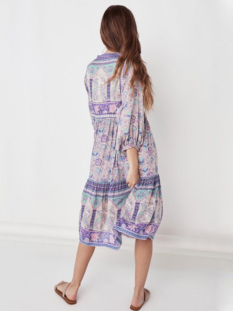 Damska Zwiewna Sukienka Z Dekoltem W Kształcie Litery V Rękawami Trzy CZwarte Boho Midi
