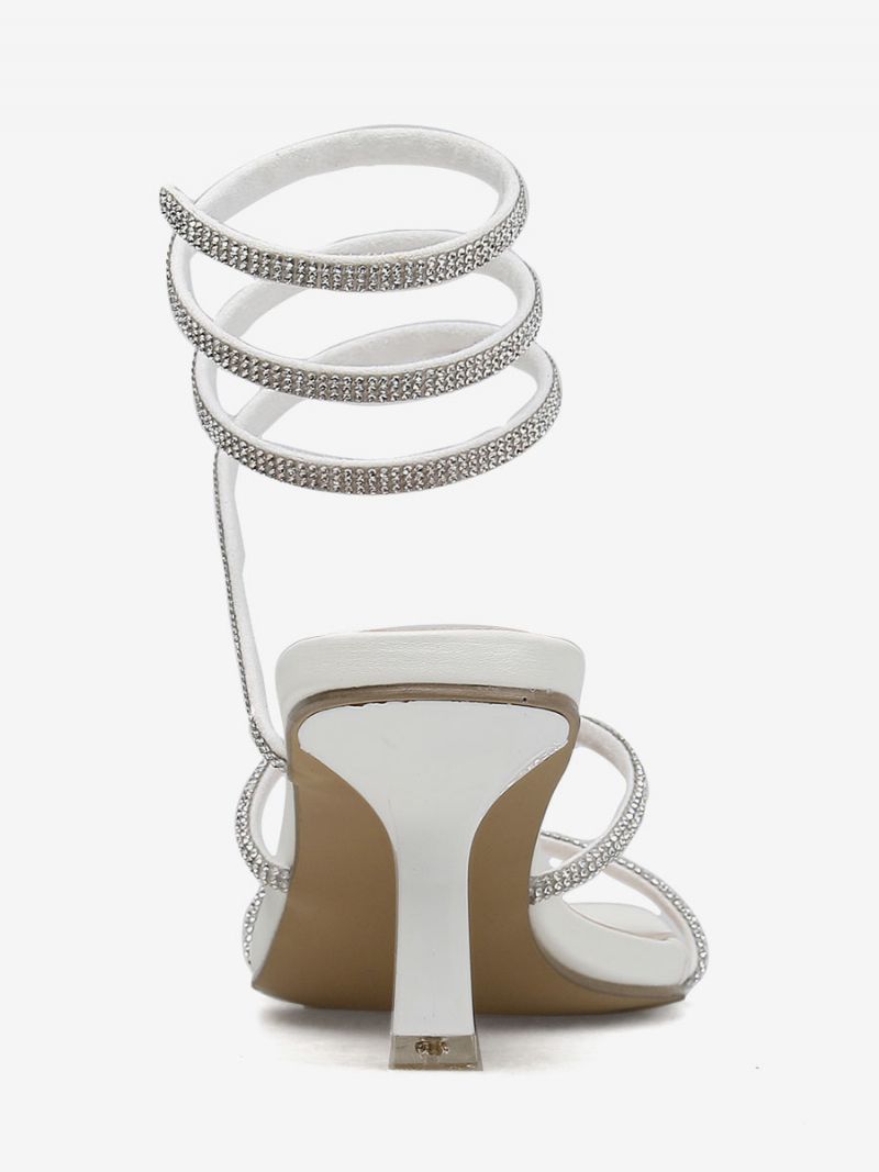 Damskie Białe Buty Imprezowe Sandały Na Wysokim Obcasie Z Kwadratowymi Noskami Kryształkami I Paskami