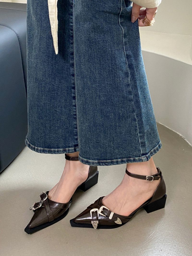 Damskie Białe Buty Na Płaskiej Podeszwie Ze Szpiczastym Noskiem Ozdobione Kryształkami I Klamrą CZółenka Z Paskiem Kostce