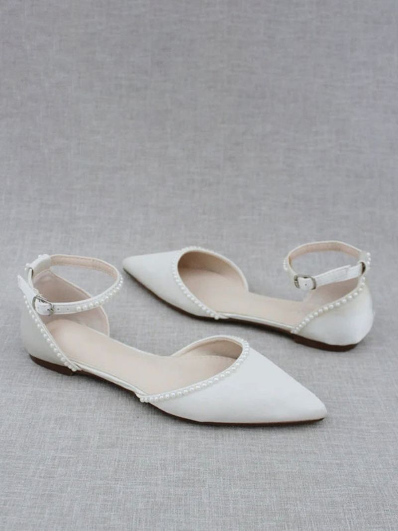 Damskie Białe Buty Ślubne Pu Skórzane Ze Szpiczastym Noskiem Perły Mieszkania Na Płaskiej Podeszwie