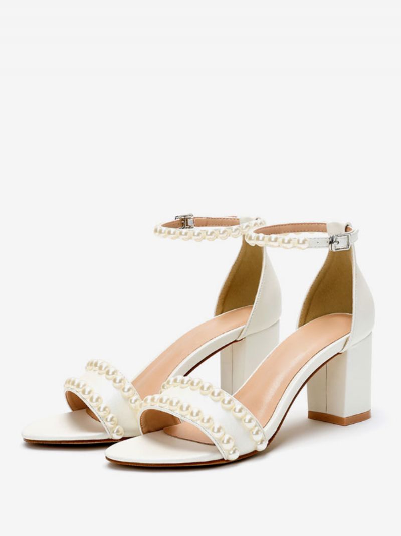 Damskie Białe Buty Ślubne Wysokie Obcasy Perłowe Sandały Z Paskiem Na Kostkę