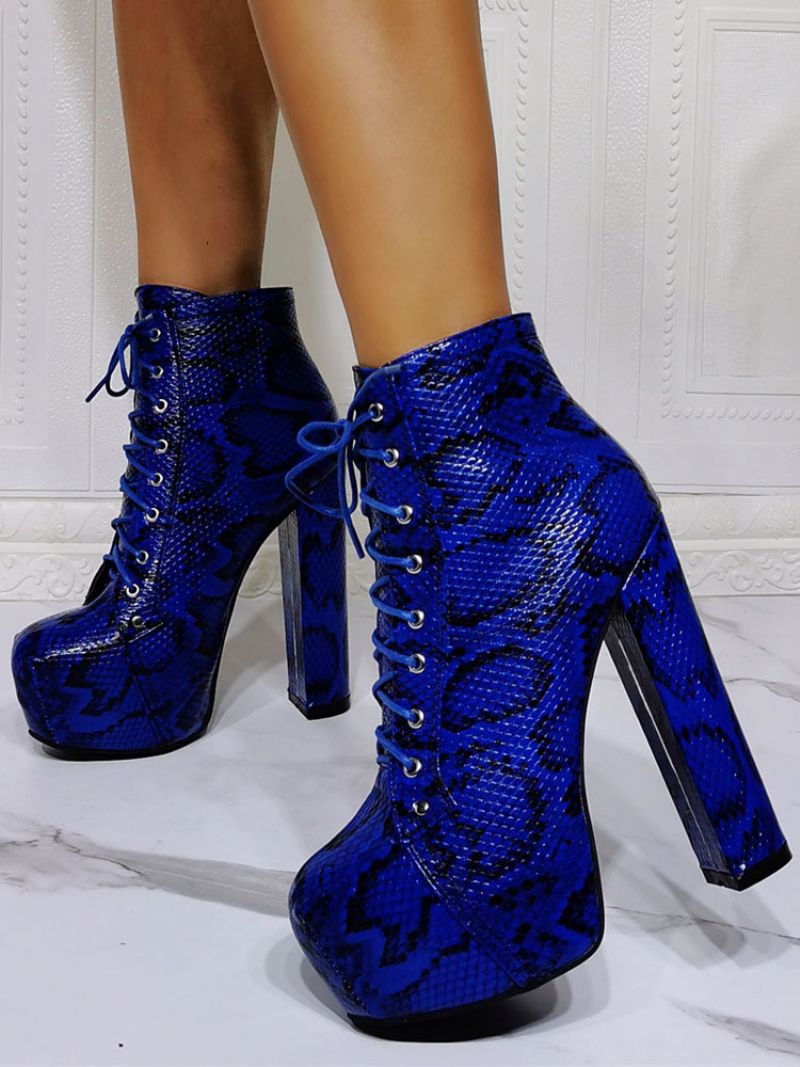 Damskie Botki Na Grubym Obcasie Ze Skóry Węża W Kolorze Niebieskim