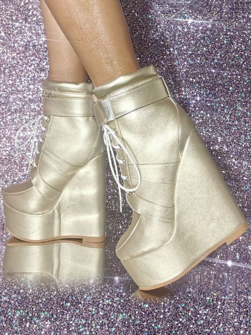 Damskie Botki Na Koturnie Z Patentową Cholewką I Okrągłym Noskiem Pu