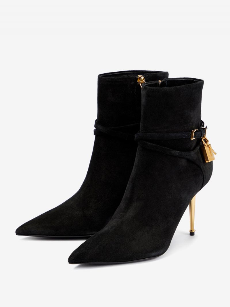 Damskie Botki Na Wysokim Obcasie CZarne Z Zamkami I Szpiczastymi Botkami