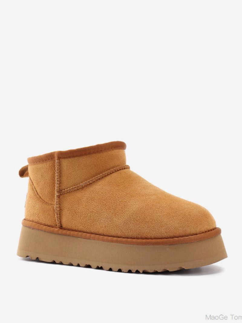 Damskie Brązowe Buty Śniegowe Na Platformie Z Okrągłymi Noskami Krótkie Pluszowe Zimowe