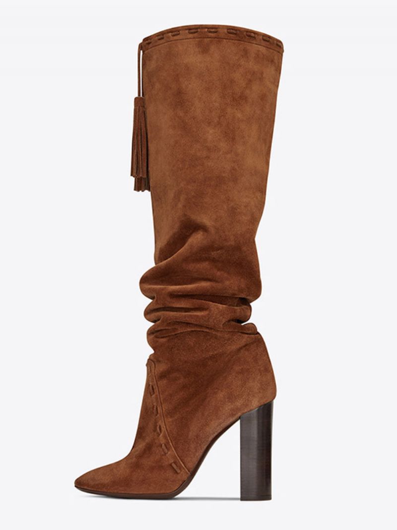 Damskie Brązowe Buty Typu Slouch Zamszowe Do Kolan Na Grubym Obcasie