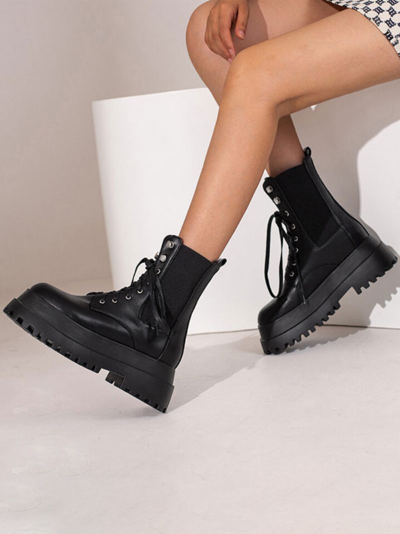 Damskie Buty Bojowe CZarne Platformy Z Okrągłymi Noskami I Botkami Na Grubym Obcasie