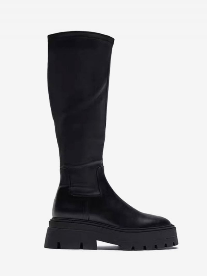 Damskie Buty Do Kolan CZarne Na Płaskiej Platformie Z Okrągłym CZubkiem