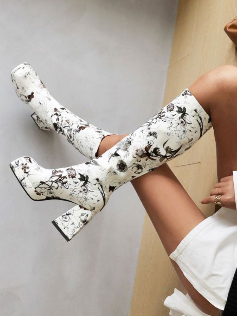Damskie Buty Do Kolan Na Platformie Z Kwiatowym Wzorem Obcasie Klockowym