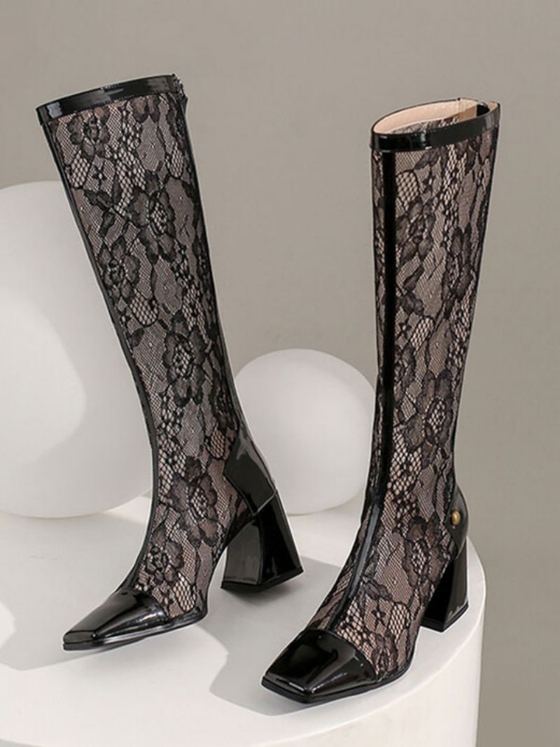 Damskie Buty Do Kolan Z Patentową Cholewką I Grubym Obcasem
