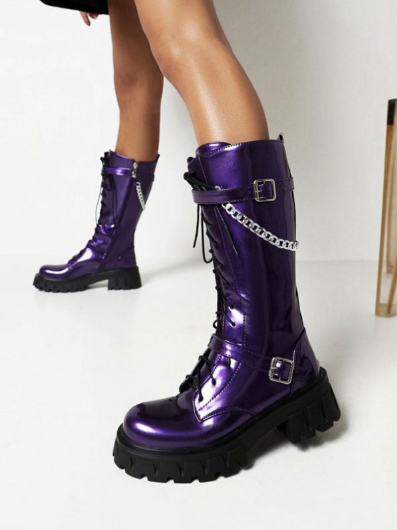 Damskie Buty Do Połowy Łydki Metalowe Detale Patentowe Z Pu Okrągłymi Noskami I Grubym Obcasem