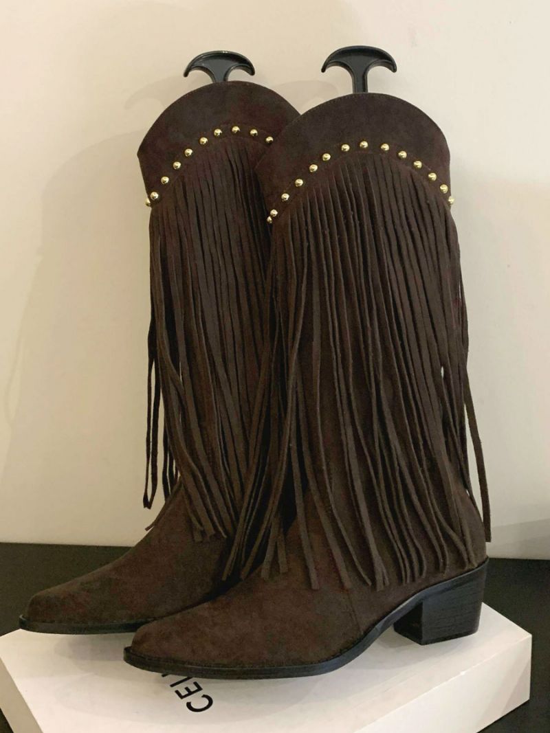 Damskie Buty Do Połowy Łydki Mikro Zamszowe Ze Szpiczastym Noskiem I Grubym Obcasem
