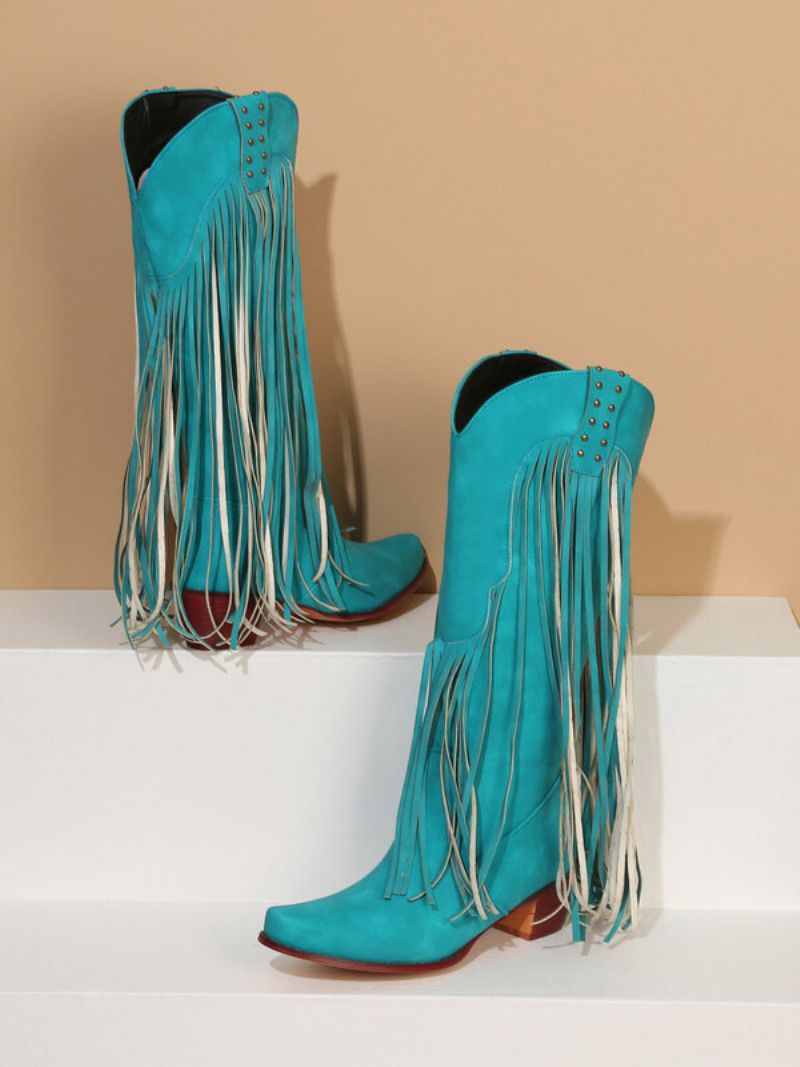 Damskie Buty Do Połowy Łydki Nabijane Ćwiekami Pu Skórzane Ze Szpiczastym Noskiem Na Grubym Obcasie