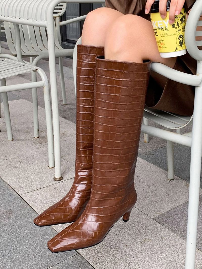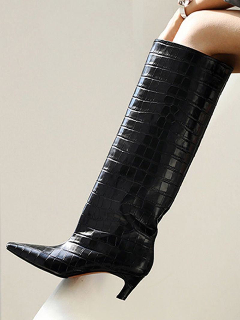 Damskie Buty Do Połowy Łydki Pu Skórzane Ze Szpiczastym Noskiem Na Grubym Obcasie