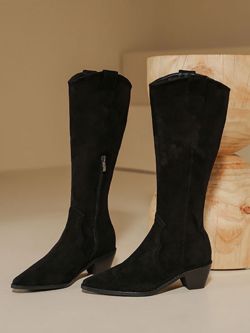Damskie Buty Do Połowy Łydki Z Mikro Zamszu I Szpiczastym Noskiem Na Grubym Obcasie