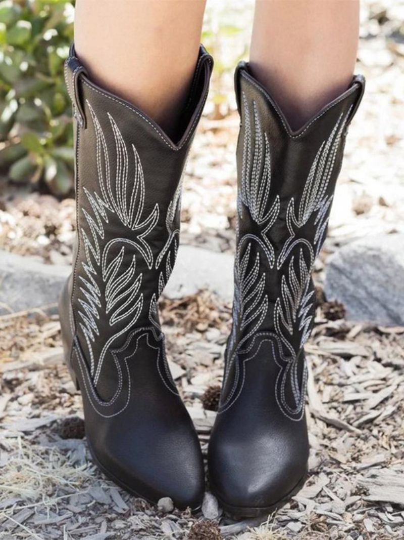 Damskie Buty Do Połowy Łydki Ze Szpiczastym Noskiem I Grubym Obcasem Skóry Pu