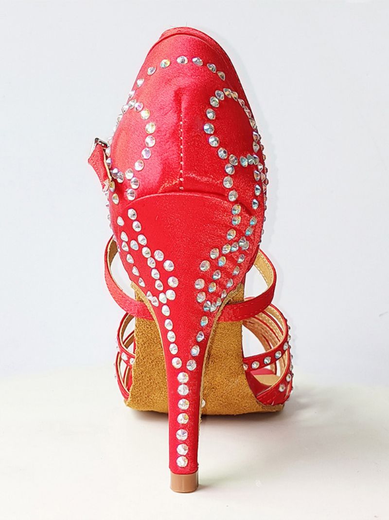Damskie Buty Do Tańca Latynoskiego Jedwabne I Satynowe CZerwone Z Okrągłymi Noskami Kryształkami