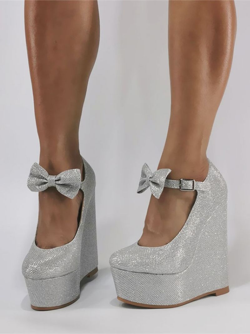 Damskie Buty Na Koturnie Z Brokatem Okrągłym Noskiem I Kokardką
