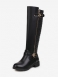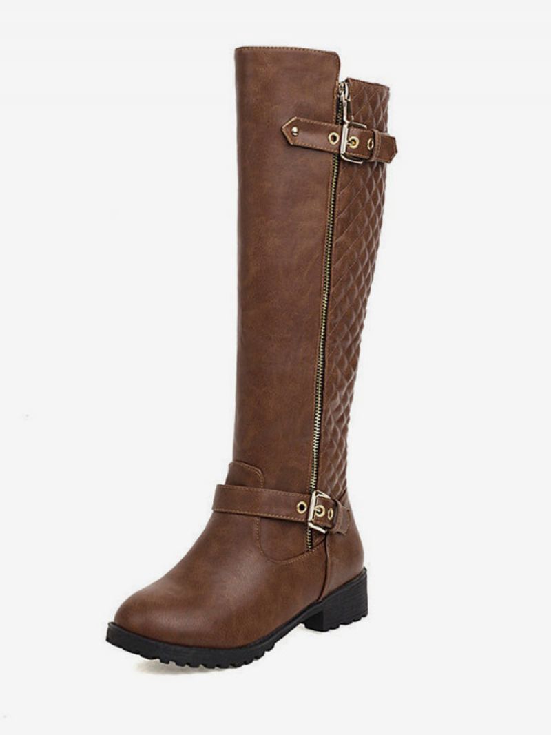 Damskie Buty Na Płaskim Obcasie Brązowe Z Okrągłym Noskiem I Klamrą Wysokie Do Kolan