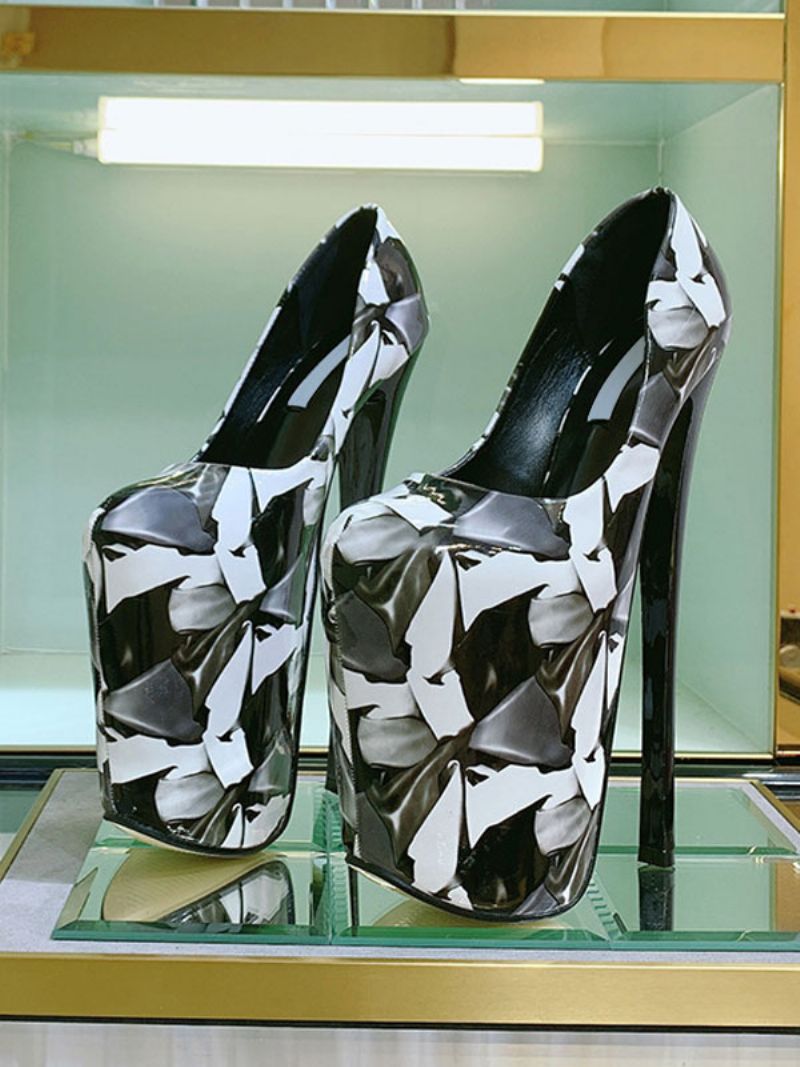 Damskie Buty Na Platformie Wysokie Obcasy CZarne Kwadratowe Z Nadrukiem Toe
