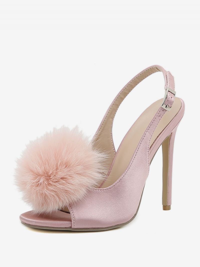 Damskie Buty Na Wysokim Obcasie Satynowe CZółenka Z Odkrytymi Palcami Szpilce I Pomponami