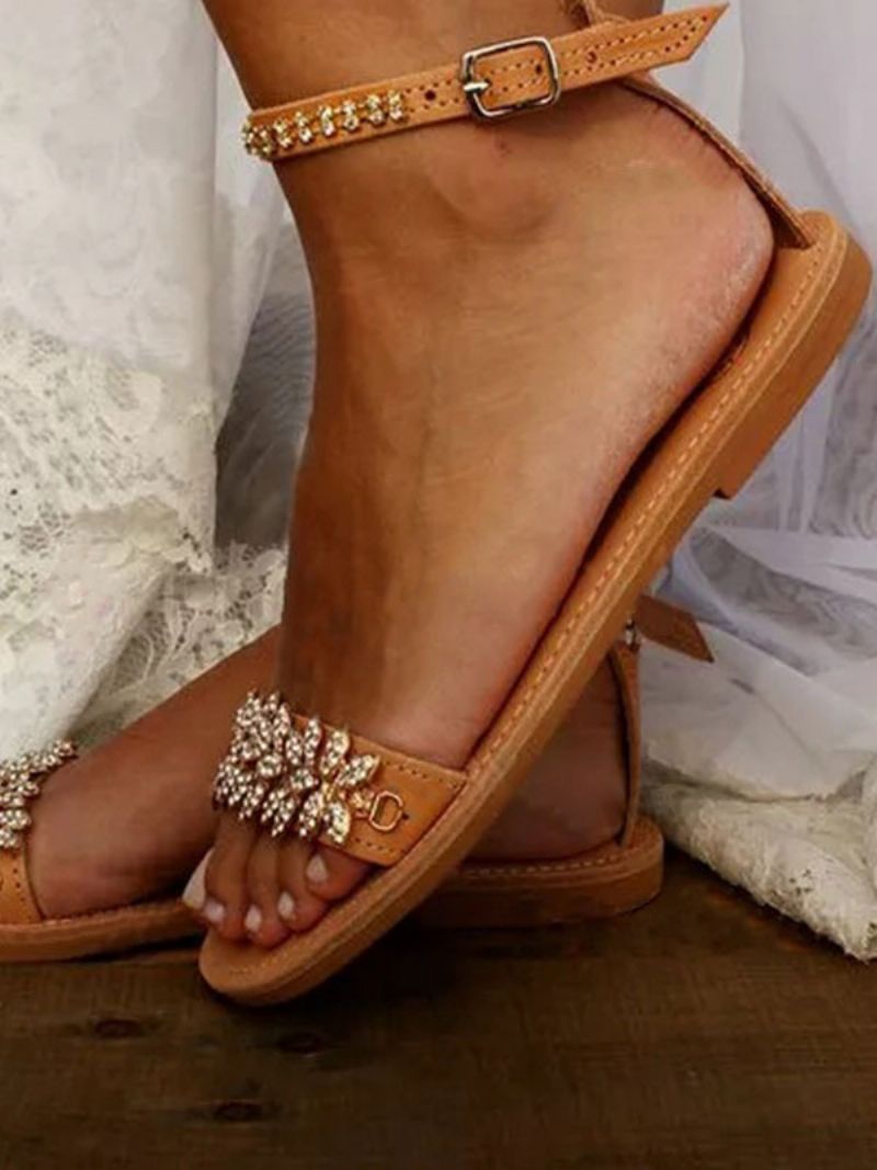 Damskie Buty Ślubne Boho Z Płaskim Paskiem Na Kostce I Kryształkami