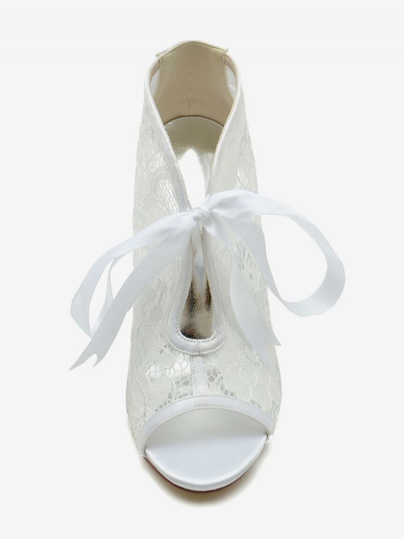 Damskie Buty Ślubne Koronkowe Białe Kokardki Sandały Peep Toe